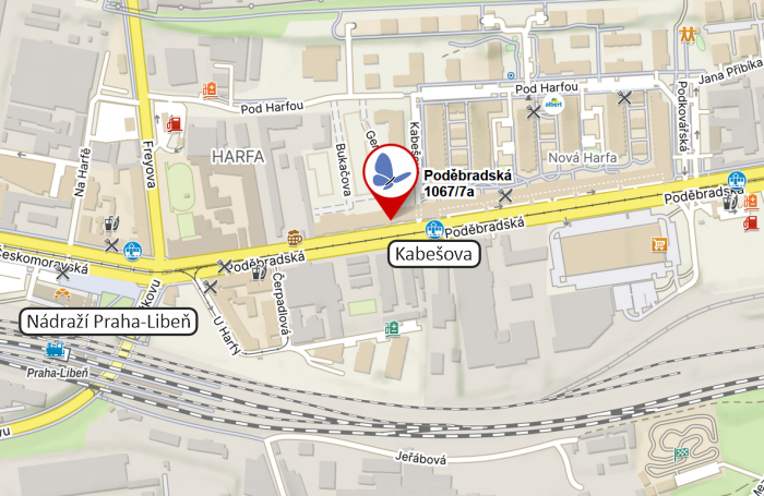 Učebny jsou umístěné v přízemí nového areálu Harfa Living. Mají samostatný vstup z ulice Poděbradská a jsou bezbariérové.